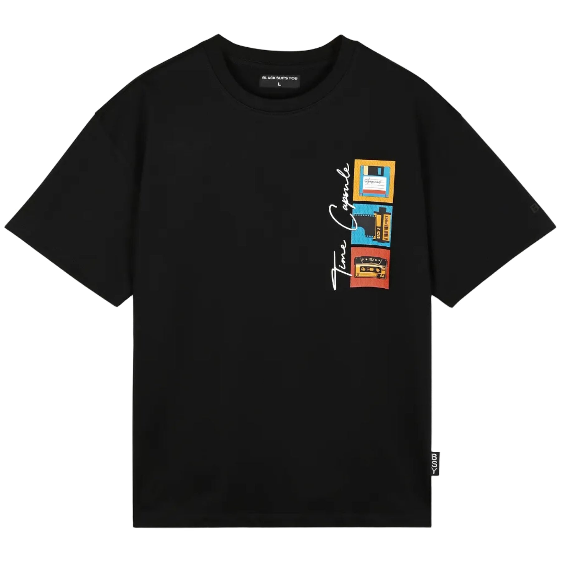 Relive the nostalgia with our TIME CAPSULE T-SHIRT! Featuring iconic symbols like a floppy disk, camera roll, and cassette, this shirt will transport you back in time. Perfect for those who want to embrace the past while staying stylish. A must-have for any vintage lover!